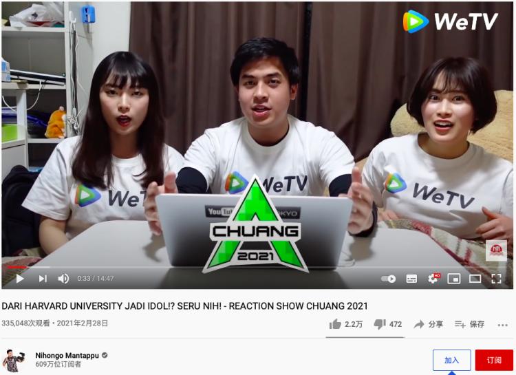 腾讯视频还专门给《创造营》开设了YouTube频道,并且邀请到了在YouTube有608万粉丝的大V、日本YouTuber Nihongo Mantappu录制了reaction视频。
