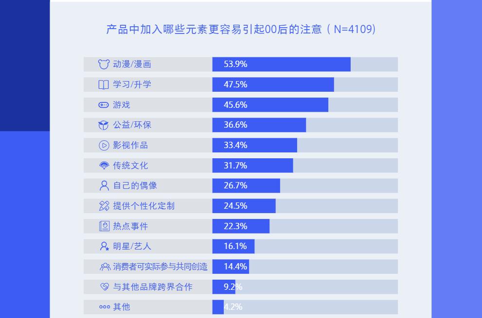 与动漫/漫画、学习/升学、游戏等方面内容元素相结合的产品,更容易引起00后的关注。