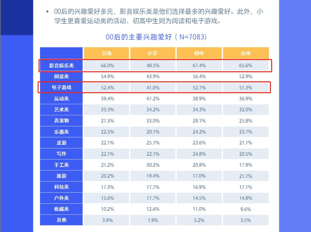 根据腾讯官方发布的2019年00后研究报告显示,影音娱乐类是00后选择最多的兴趣爱好。电子游戏的占比也达到了52.4%,其中初高中生居多。