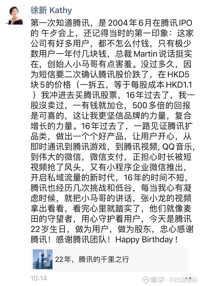 2020年,腾讯22岁生日之际,徐新在朋友圈中发长文庆贺并回忆和腾讯的过往。