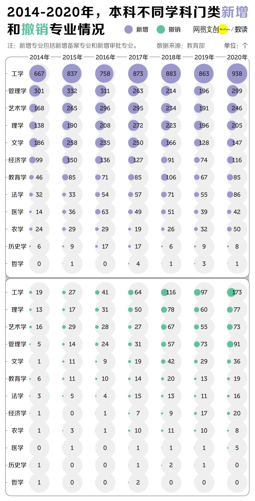 除了工学专业,七年间新增最多的是管理学、艺术学、理学和文学,撤销最多的学科门类也是这几个,只不过排名有些差别,分别是理学、艺术学、管理学和文学。