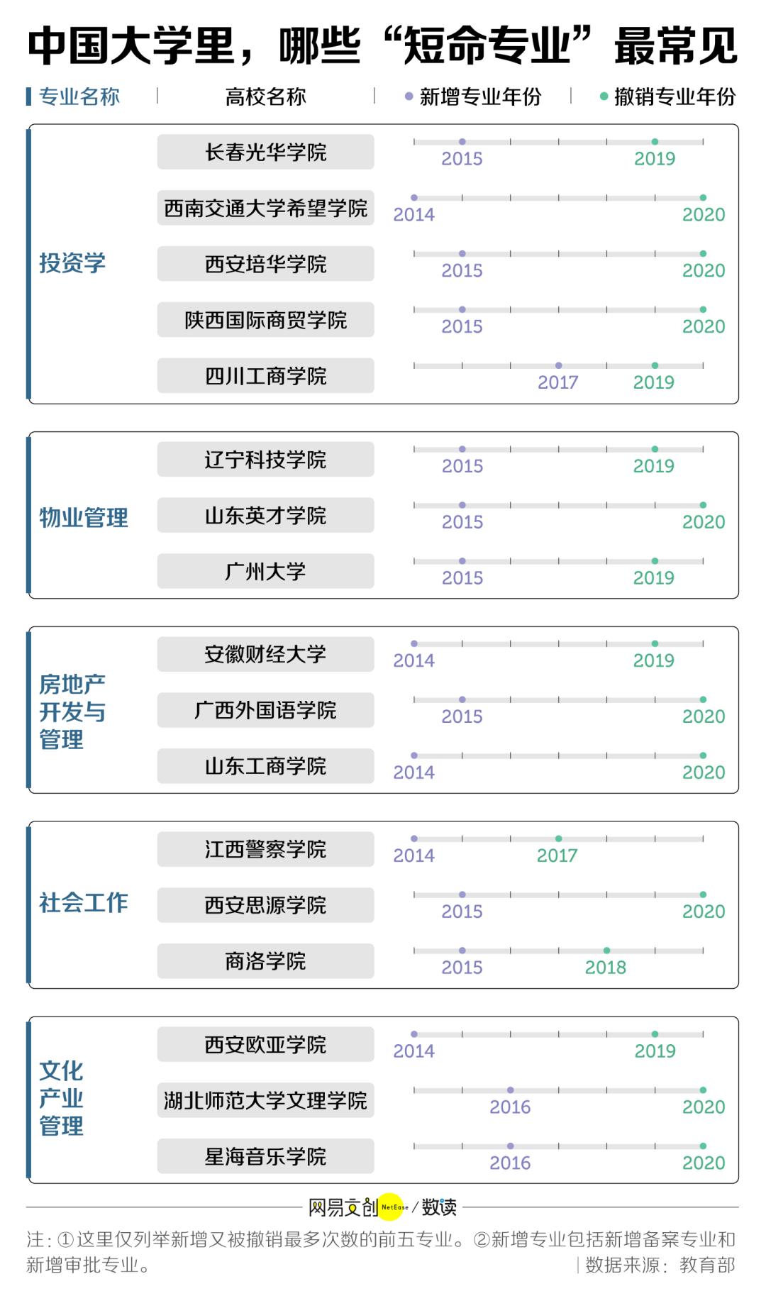 最常见的“短命专业”前五名分别是投资学、物业管理、房地产开发与管理、社会工作和文化产业管理,多个高校开设后不到 5 年便又将其撤销,最“短命”的甚至只开设了两年,还不够首届学生从入学到毕业的学习周期。