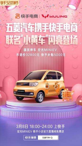 快手电商与五菱汽车于今日达成合作,五菱宏光MINI EV“自在款”整车将在“3.8女神节”期间由快手达人在快手小店直接售卖。