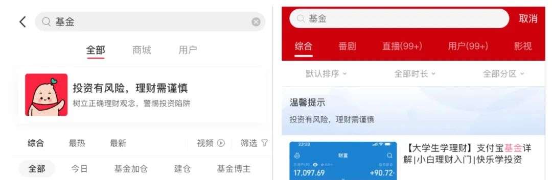 在风险预警方面,有些平台做了一些改变, 在B站和小红书搜索基金后,会在上方显示“投资有风险,理财需谨慎”的文字提醒。