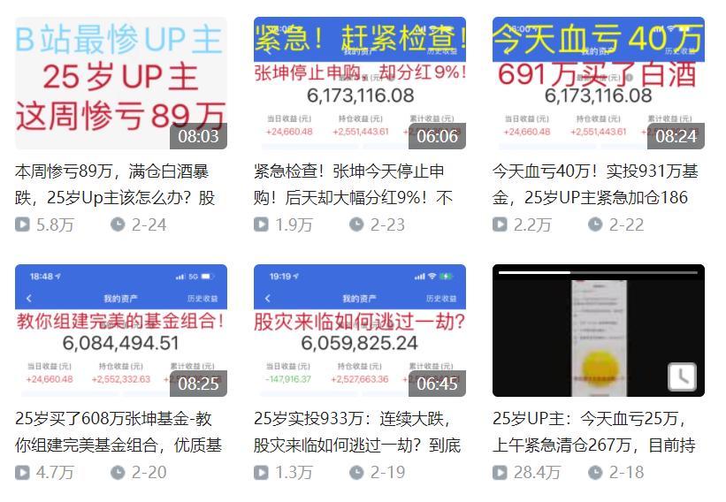 而那些活跃在各个社区、缺乏资质的“野生基金大神”,也在持续下跌的行情中露出了真面目。做基金实操展示的UP主“蛋黄哥-千万基金实投”的视频标题,从年初的《赚爆,冠军基一年涨183%》,变成了现在的《25岁最惨UP主》《血亏117万》等。