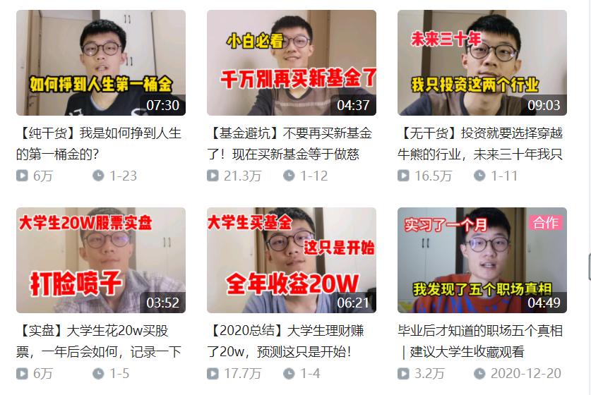 他的第一个有关基金的视频是《大学生理财赚20W,预测这只是个开始》,视频中干货内容不多,甚至都没有任何基金实操界面、数据分析,只是靠口述就足以让急于入门的“小白们”心动,误认为自己也能成为年入几十万的大佬。