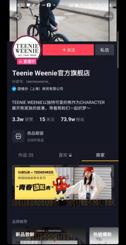 不只是KOL直播,品牌方自播更在逐渐成为蓝V号的标配。飞瓜数据显示,近日带货榜日榜第十为“Teenie Weenie官方旗舰店”,日预估成交额593万元,对于一个粉丝仅73.9万的账号来说,这是一个极为优秀的数据。