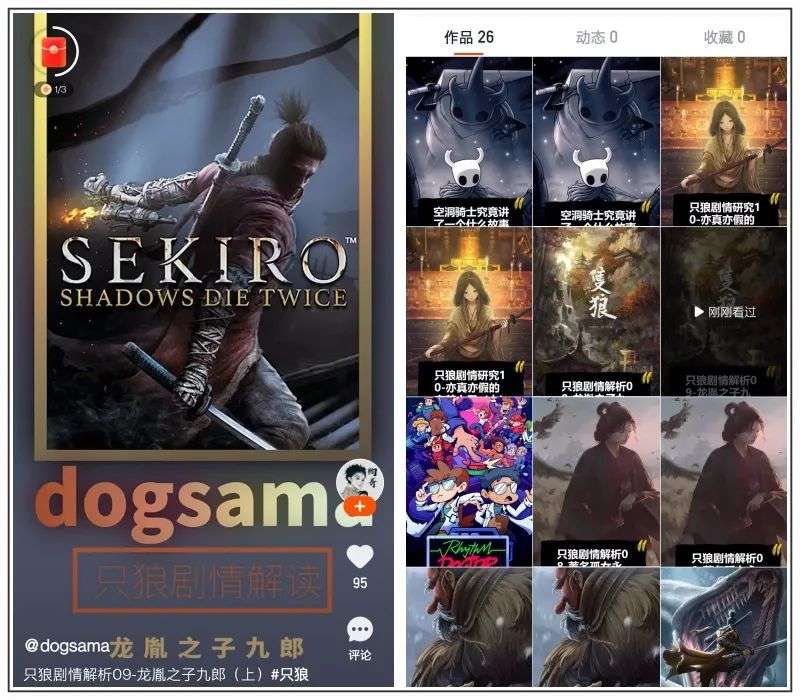 Dogosama 的视频作品,多是对独立精品游戏的深度解析和测评。而在快手上,貌似小众、硬核的游戏品类,也有其广泛的受众。