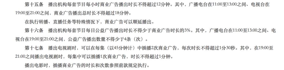 自2010年起执行的国家广播电影电视总局令第61号第十五条和第十七条规定,电视台19:00至21:00黄金时间段商业广告总时长不得超过18分钟,播出的电视剧中插广告不超过1分钟。