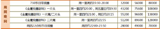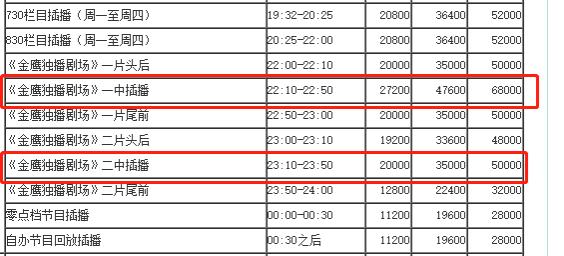 以湖南卫视为例,2010年湖南卫视公布的广告收入是36亿。根据刊例计算,湖南卫视的《金鹰独播剧场》的中插广告共有两段,5s、10s、15s硬广的刊例价如下: