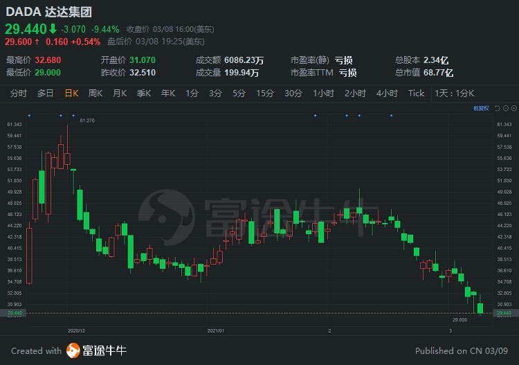 周一,$达达集团(DADA.US)$收跌超9%,股价报29.44美元。