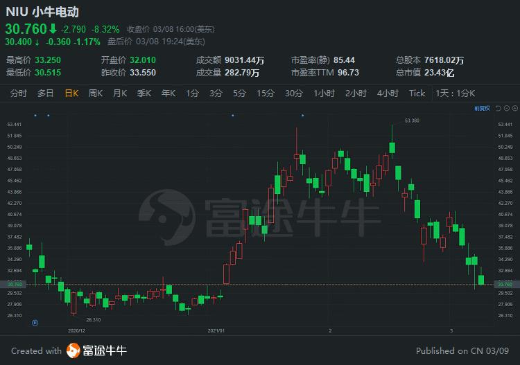 周一,$小牛电动(NIU.US)$收跌超8%,股价报30.76美元。