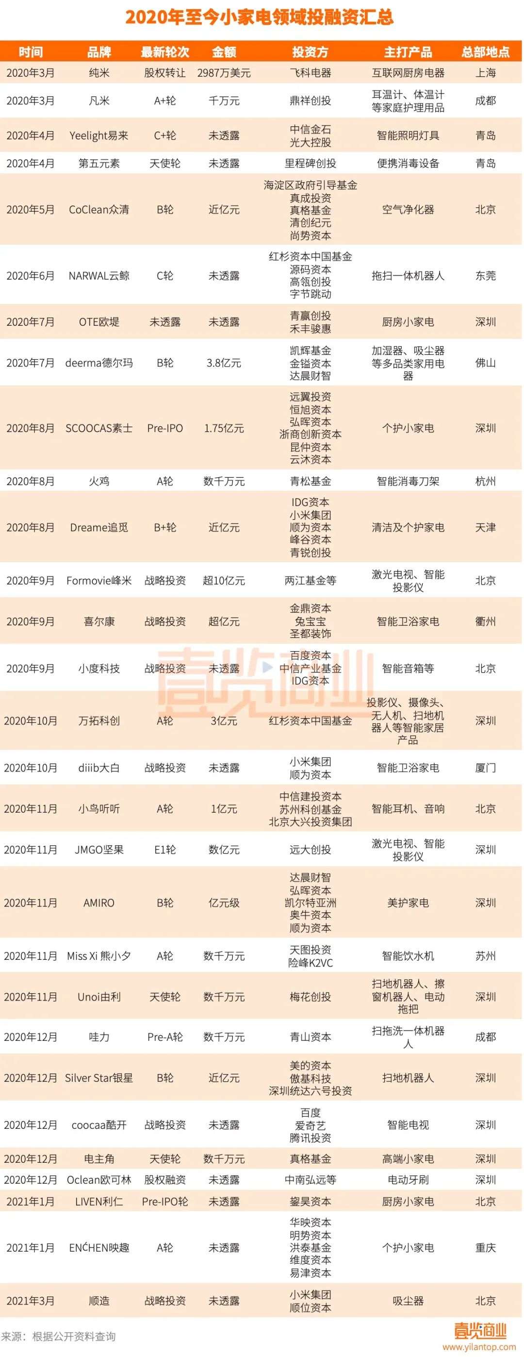 从创投一级市场看,小家电赛道也异常活跃。据《壹览商业》从2020年初至今,一级市场上小家电共发生投融资事件29起,融资金额超过30亿元人民币。