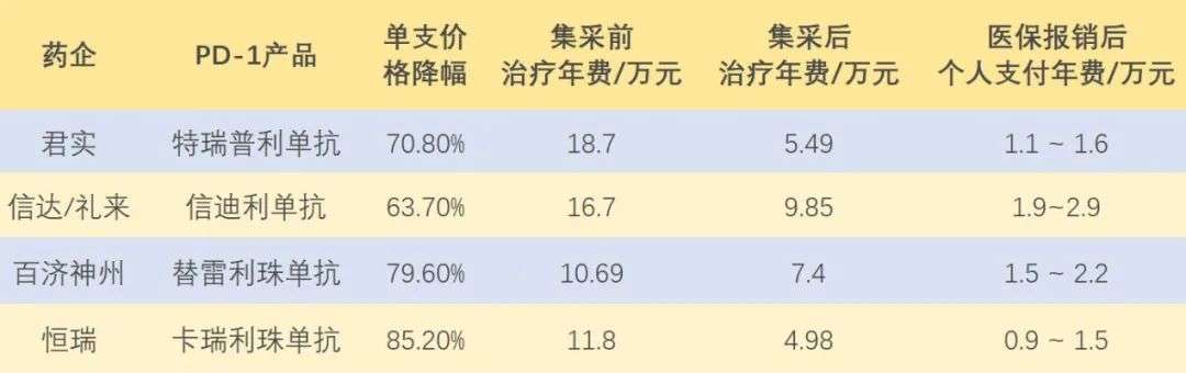 此前售价高达十余万的PD-1产品,医保报销后,价格最低的卡瑞利珠单抗,患者个人一年仅需支付0.9万至1.5万。
