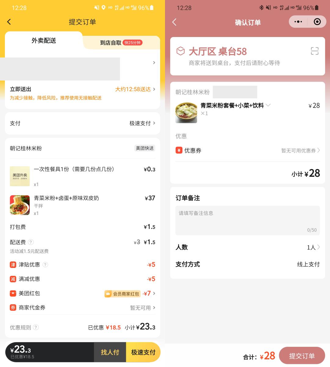 同菜品包含送货费 23.3 元,堂食 28 元无折扣