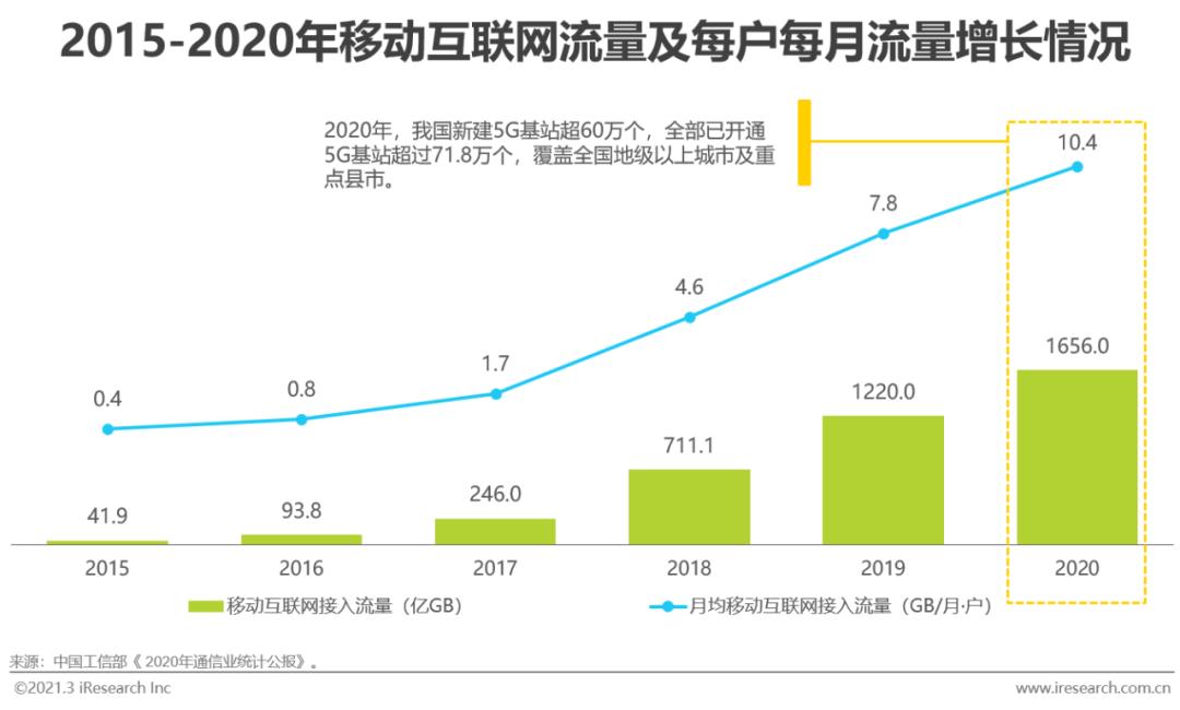 根据信通院统计数据,2016至2019年,中国三次产业数字经济渗透率稳定上升,服务业数字经济领域领先发展,2020年以电商直播为代表的直播经济进入千家万户,成为各行各业商业发展的核心动能,为企业创造了新的发展机遇。在这一背景下,企业直播等数字化转型服务供应商积极发挥自身的技术及产品优势,向具有业务线上化转型需求的企业输出解决方案。而作为中国数字经济发展的重要引擎之一,我国移动互联网在2020年加速了5G建设步伐,直播电商、云展会等新业态不断涌现,使移动互联网流量消费持续增长,整体移动网络环境为直播在用户端的广泛覆盖和渗透提供了良好的基础。
