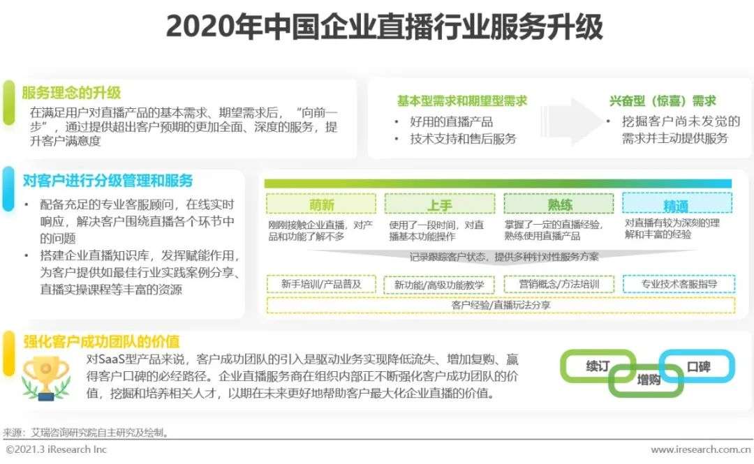 根据艾瑞对多家中国头部企业直播服务商的调研,经过2020年的市场洗礼,企业直播服务商在服务能力提升方面也做出了大量努力,以降低客户流失。在产品满足企业用户需求的情况下,深度、细致、超出客户预期的服务能够有效提升企业用户的复购概率,赢得好的口碑,从而带来潜在的增长。