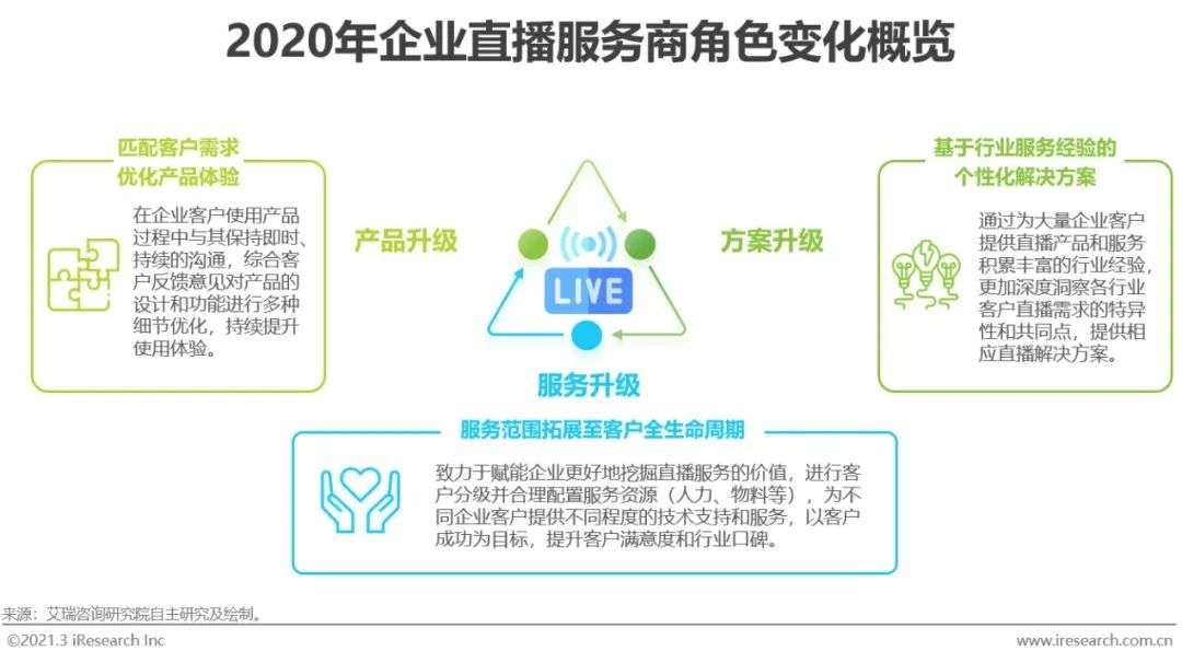 经过2020年的大规模应用和高速发展,企业直播服务商从可替代性较强的直播工具类角色向综合、一体化服务商方向发展。其变化主要体现在直播产品、行业解决方案和综合服务能力三个方面的升级。产品方面,2020年短期内激增的市场需求成为服务商直播技术和产品力的试金石,服务商通过配合大量客户的不同需求进行直播产品的迅速更新迭代打磨出了用户体验更佳的直播产品;解决方案方面,在实践中积累的客户服务经验和成功案例帮助服务商更加深入理解不同行业客户的直播痛点和需求差异,在此基础上推出更加个性化、体系化的行业客户解决方案;服务方面,直播服务的边界进一步拓宽,服务商针对不同类型的企业客户进行更加精细化的运营,结合自身优势全方位助力客户成功。