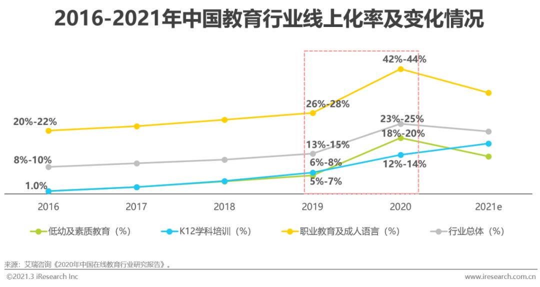 2020年,企业对直播的需求在疫情严重时期激增,虽在疫情平稳后需求量有所回落,但由于部分新增客户的使用习惯延续,B端市场直播的整体渗透率仍在疫情推动下相较于2019年有较大的提升。以对直播服务需求量巨大的在线教育行业为例,根据艾瑞自主统计核算,在线教育整体和细分市场的线上化率在2020年有突出上升。其中,直播是K12学科培训、低幼及素质教育线上化的主要形式。同时,从企业直播服务商微赞的安卓端APP产品累计下载量变化看,2020年2月到4月下载量增长显著,在疫情平稳后的几个月仍然保持稳定增长,侧面反映出企业客户对企业直播服务的兴趣和关注依然持续。