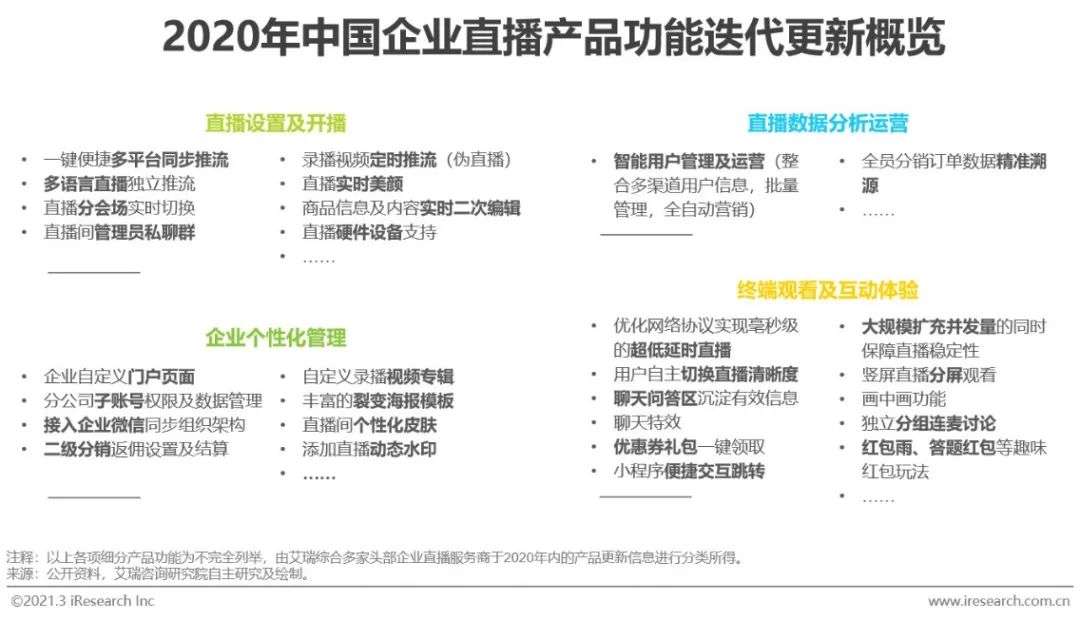 就企业直播产品的变化而言,虽然2020年行业内未出现较大的技术突破,但具体到直播产品的设计优化和功能迭代,头部企业直播服务商均全力配合企业客户的细微需求,在产品细节打磨和迭代速度上表现出高度的积极性,在短短一年间持续进行了至多达百余次的产品更新,不断提升客户的产品使用体验和满意度。整体来看,企业直播产品在直播设置和开播、企业个性化管理、直播数据分析运营、终端观看及互动体验等多个方面的功能有了较大提升。