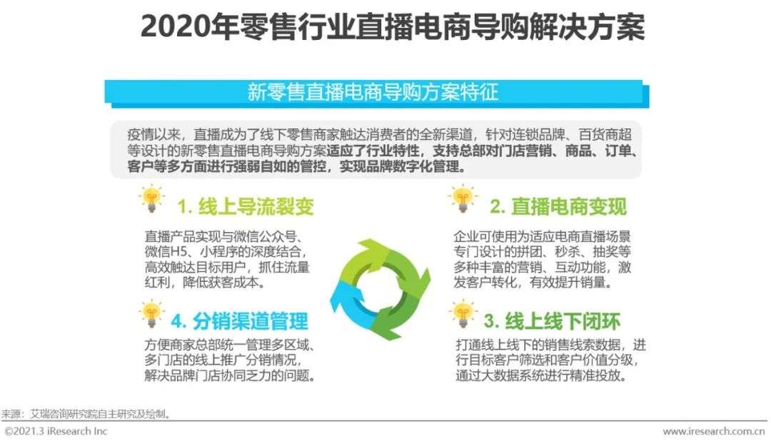 当2020年初疫情突发,线下商业活动停摆时,大量不同行业、不同规模的企业尝试通过直播将部分业务线上化转移,而各行业企业希望通过直播力挽狂澜的同时,也为企业直播服务商带来了挑战:现存的企业直播产品愈发难以同时满足不同行业不同业务场景下的细分应用需求。以依赖于线下门店销售的传统实体零售行业为例,一场总部发起的线上直播带货虽声势浩大,而实际的推广分销数据若在直播产品中不能得到清晰的溯源,商家便难以推行透明的考核机制,因而容易导致员工积极性降低。因此,结合各行业的大量企业客户的产品反馈,企业直播服务商迅速针对不同行业的直播需求进行拆解,推出更加适应行业特性的体系化、便捷易用的行业解决方案。