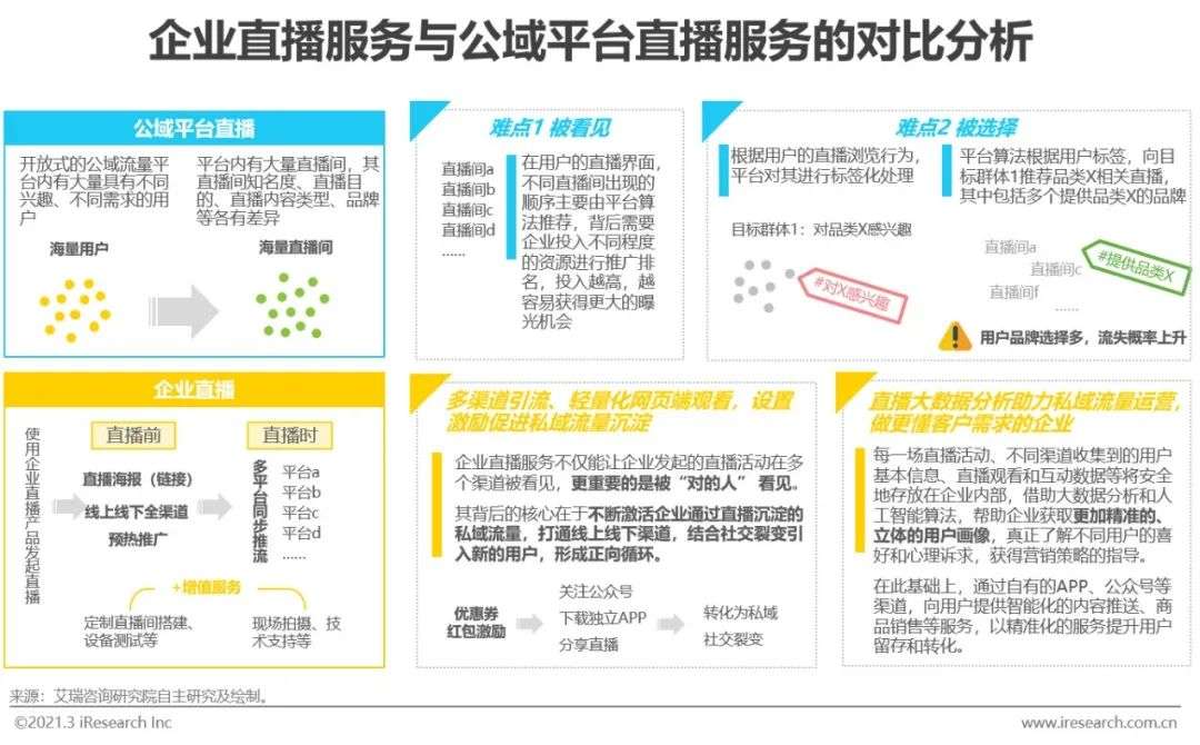 在营销获客场景下,企业直播服务相对于电商、短视频等提供直播服务的公域流量平台(如淘宝、抖音、快手等)的突出优势在于对企业私域流量价值的沉淀、企业品牌影响力的强化和运营效率的提升。