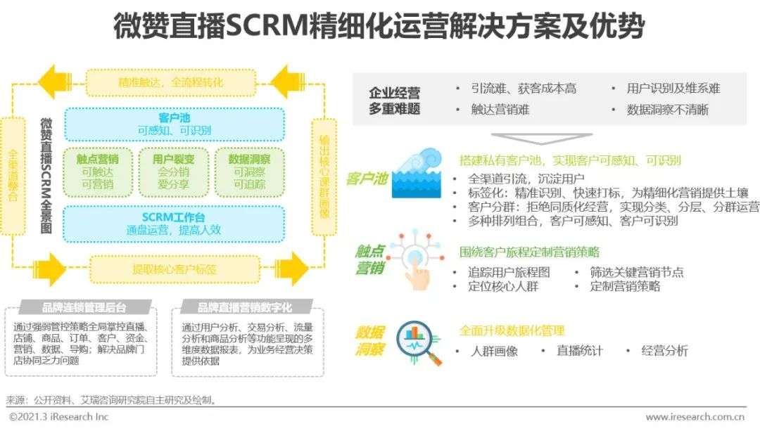 企业在进行私域流量池打造的过程中,离不开客户关系管理(CRM)。社会化客户关系管理(SCRM)是企业全生命周期的客户经营,注重开放的信息传输、高频互动和数据智能分析,从而提升效率。微赞致力于通过直播引流+用户SCRM精细化运营为企业提供高效的私域流量解决方案。通过全渠道用户导入,形成私域流量池,做进一步的客户分层和触达,从而完成对用户全生命周期管理,实现数字化转型升级。