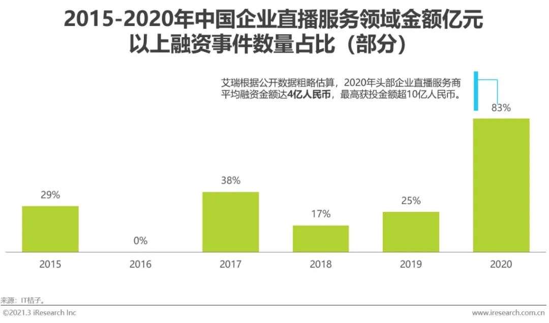 盘点2015年以来企业直播服务领域主要企业的投融资事件轮次分布,可以看出,B轮及C轮融资事件比例增加,2020年所有融资事件均为Pre-B轮及以上。在这些融资事件中,金额超过亿元的事件数量占比在2020年达到83%,平均融资金额在4亿人民币左右。可以看出,2015年起的C端泛娱乐直播爆发对企业直播服务赛道受到投资人的关注有一定推动作用,而经过2020年疫情的考验,产品更加成熟、商业模式更可验证的企业直播服务厂商将获得更多投资人的关注。