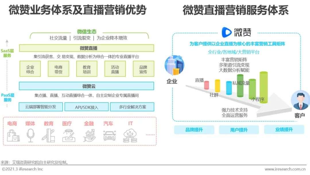 微赞创立于2015年,是一家专注微信生态的企业级直播SaaS服务提供商。微赞以成为国内领先的微信营销SaaS服务商为发展目标,目前已经建立微赞直播、微赞云、知播教育、芯象导播等领域立体化业务体系。微赞直播是建立于微信生态之上,基于微信集合了内容、互动、支付、电商等功能的特点,建立了以企业直播为主,帮助企业获客和品牌营销的SaaS工具,为企业建立一站式互动和变现入口。目前,微赞直播已经搭建起了行业内领先的企业直播SaaS服务平台,为全行业提供行业垂直场景化、相对成熟的专业企业直播SaaS服务。