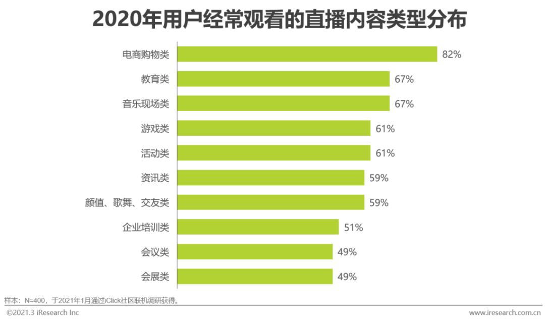 2020年,用户在直播观看渠道和观看内容类型上都发生了显著的变化。一方面,用户观看直播的渠道变得更加丰富和便捷:艾瑞调研显示,除了广为人知、较早涉猎直播的社交娱乐平台、电商平台和视频平台之外,微信小程序、网页H5、其他垂直类APP等企业直播服务主要覆盖的渠道也成为超过60%的被调研用户经常观看直播内容的渠道。另一方面,用户经常观看的直播内容类型也呈现出多样化的特征:例如,音乐现场、活动、企业培训、会议、会展等传统上以线下形式为主的场景而今也是用户常看的内容类型。这些传统线下场景的线上化呈现,通常离不开企业直播服务商的产品和服务支持。