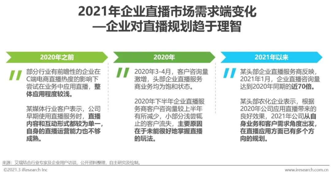 目前,抗疫紧张阶段已经过去,伴随企业直播的功能优化和服务能力提升,企业客户对直播的依赖度、重视度有了显著上升,也逐渐积累了一定的直播、市场观察经验,具备了自主规划直播的能力。结合针对B端使用直播服务的企业访谈获取到的信息,艾瑞分析认为,2021年,B端市场对直播仍将保持信心与热情,企业将更多重点放在如何借助直播,对多元化的渠道、业务展开探索。