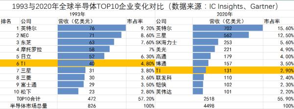 翻开全球半导体行业Top10榜单,从1993年起,德州仪器即名列其中。探究30年间,德州仪器在半导体市场几番沉浮而不倒的原因,其在全球半导体产业链中拥有极其重要的战略位置。