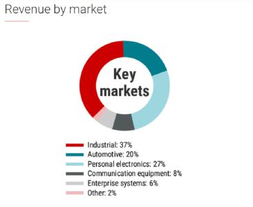 2020年工业市场和汽车市场营收占到了德州仪器的57%,这一市场也成为了德州仪器的主要市场。