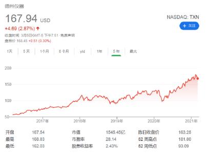这家公司就是德州仪器(Texas Instruments)。数据显示,2020年,德州仪器在全球半导体公司中排名第七,并已连续多年入选“世界500强”公司。股票信息显示,2016-2021年,德州仪器市值翻了近三倍。