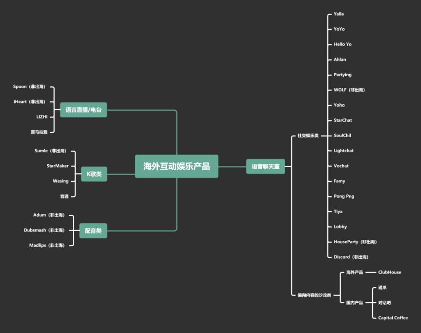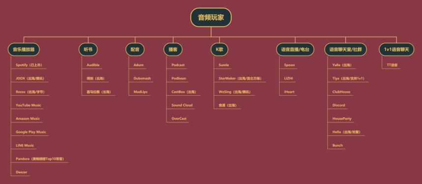 由上图可见,音乐播放和语音聊天室是海外发展最繁茂、同时也是竞争最激烈的两个细分领域。