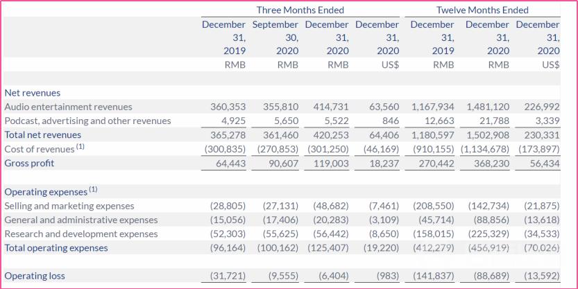根据财报官方表述,2020 年营收增长的主要原因是,付费用户总数的增加、荔枝互动业务收入的增加、播客业务的增长以及广告商数量的增加。