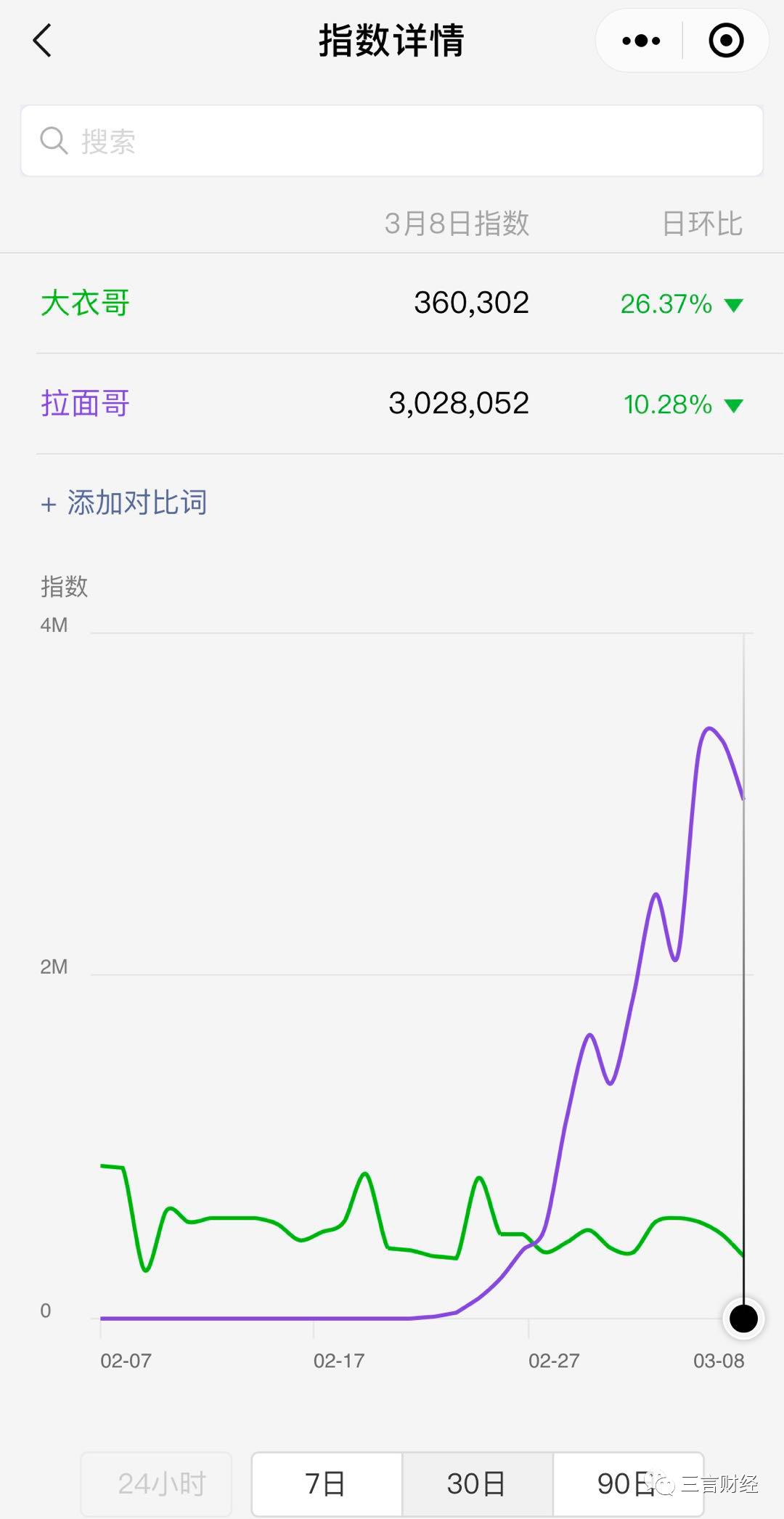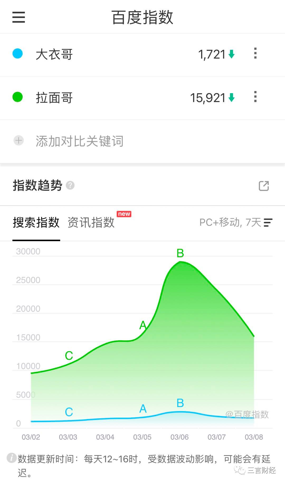 无论是百度指数,还是微信指数,近10天拉面哥的搜索指数从无到有,并实现了成倍的增长。