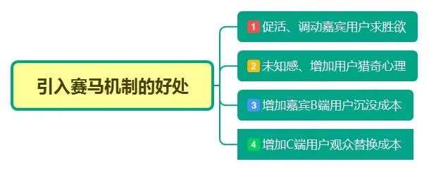 第三,增加嘉宾用户沉没成本。此处用户,指台上参与嘉宾B端用户,当嘉宾参与竞技,一旦投入不会迅速离场,一旦进入状态,对之前付出格外珍惜,从而引发更多投入。