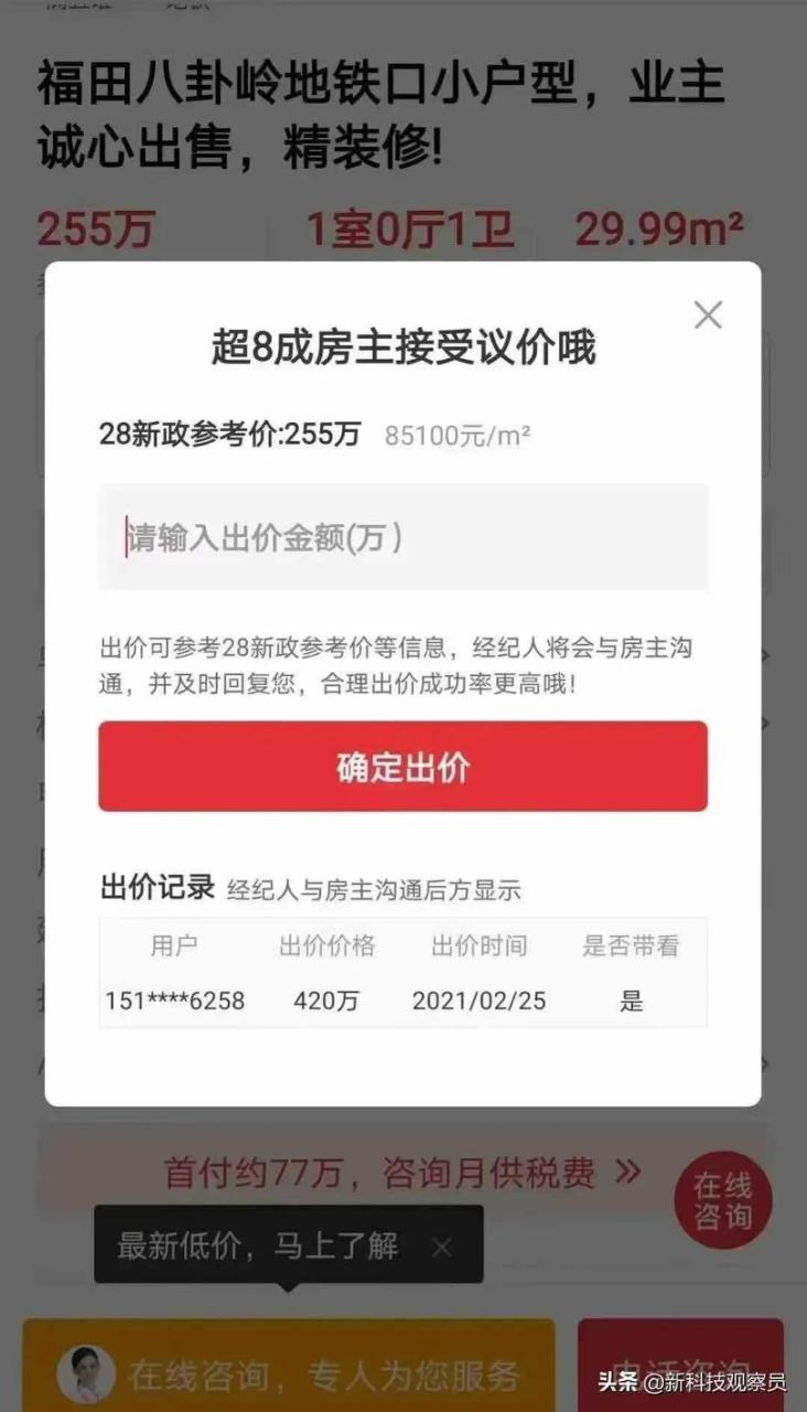 不过据某自媒体发文称,深圳已有中介突发奇想来了“竞价买房”,政府参考价位255万元的房源,已有出价记录为420万元,几乎翻倍。