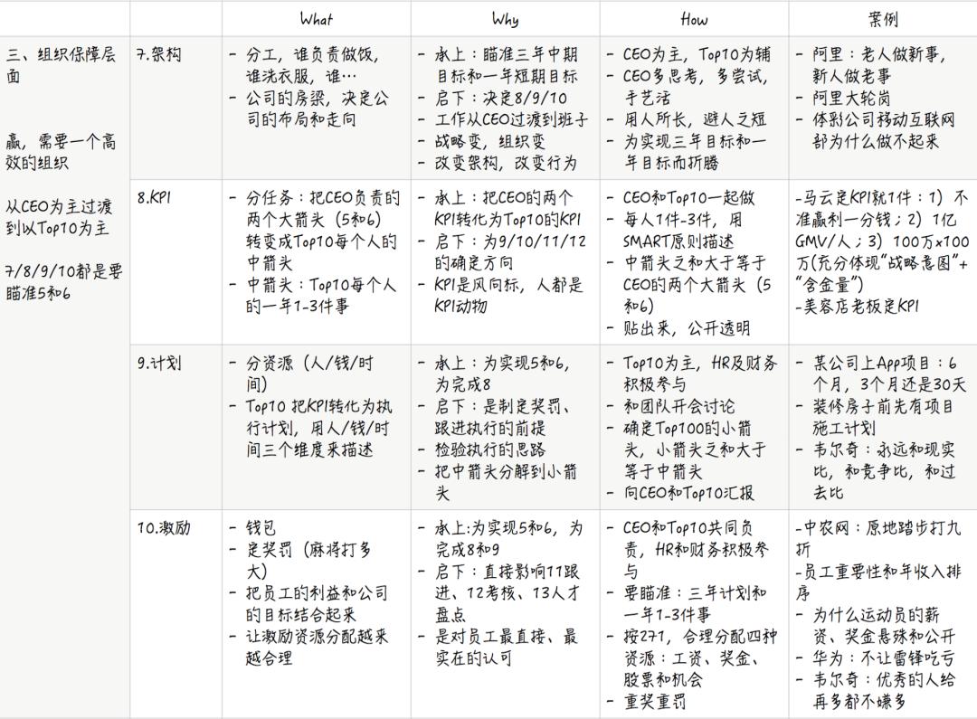 组织保障层面:7.架构、8.KPI、9.计划、10.激励。