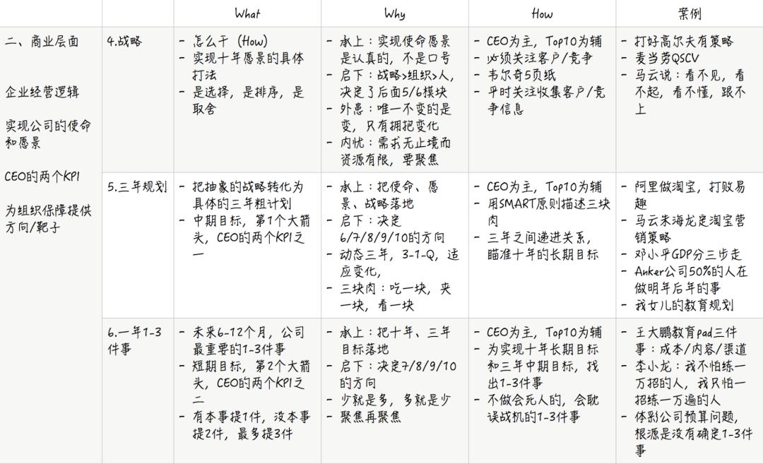 第二个层面,叫商业层面,包括4.战略、5.三年规划、6.一年1-3件事。