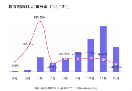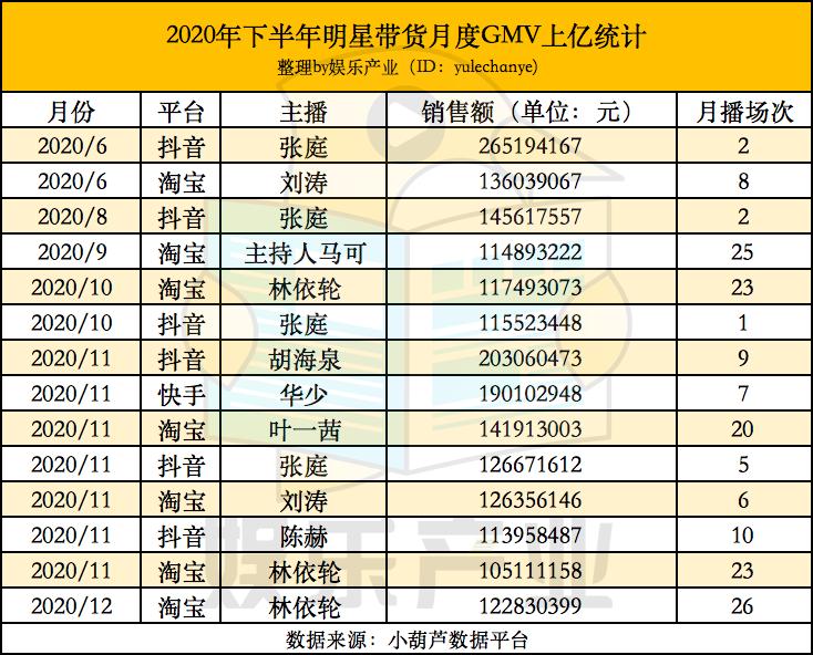 据小葫芦数据统计,2020年下半年,月度GMV上亿的明星有14个名额,11月有7位明星月度,而12月仅1位。
