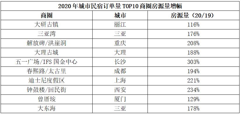 大研古镇、三亚湾、解放碑/洪崖洞、大理古城和迪士尼度假区,这五大商圈2019-2020年,除了个别名次略有变化外,基本保持稳定,巩固了城市民宿商圈“第一梯队”的地位。
