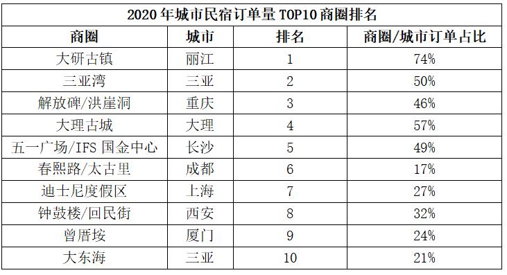 商圈能够给城市民宿带来的订单量越多,价值度就越高。途家民宿数据统计显示,2020年国内城市民宿订单量排名最高的十大城市商圈:
