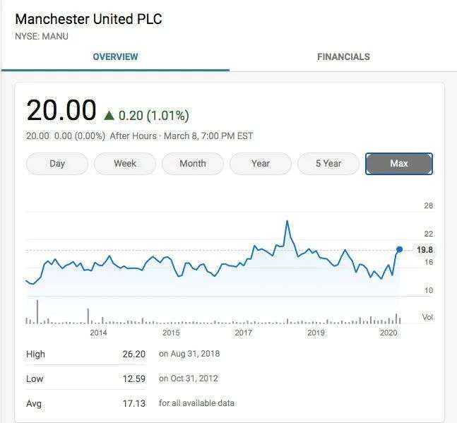 2012 年,由于严重的债务压力,格雷泽家族拿出部分股份,让曼联再次在纽约证券交易所上市,多年来股价一直在 10~25 美元区间内徘徊,正如曼联俱乐部本身的表现,为了对股东负责、降低运营成本,曼联对大举出击购买优质球员总是犹犹豫豫,常被球迷诟病。