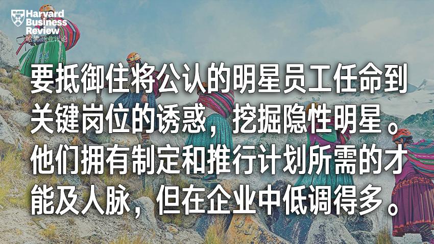 要抵御住将公认的明星员工任命到关键岗位的诱惑。相反,要挖掘隐性明星,他们拥有制定和推行计划所需的才能及人脉,但在企业中低调得多,因此超负荷工作的可能性远没有那么大。另一个好处是,这些人通常受公司“这就是我们这里做事的方式”心态的影响较少,因此可以给一个正寻求重新定义流程及重点的项目带来新鲜的视角。为关注度高的敏捷团队选择这些不太惹眼的人,还可以让企业建立更深层的后备人才库。