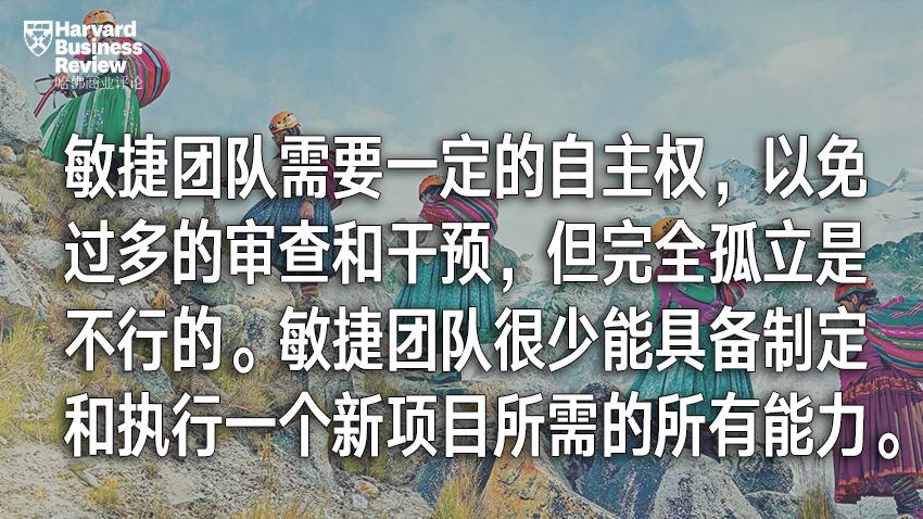 这种方法因为克莱顿·克里斯坦森(Clayton Christensen)的颠覆性创新手册而流行起来。可是,孤立会给项目带来损失。诚然,敏捷团队需要一定的自主权,以免过多的审查和干预,但完全孤立是不行的。敏捷团队很少能具备制定和执行一个新项目所需的所有能力。一个团队通常必须从公司其他部门获得专业知识,了解问题的全貌,弄明白不同地域或客户的细微差别并预见快速变化的竞争局面。此外团队还要与企业的利益相关者接触,在需要资源和实施计划的时候赢得支持,这一点至关重要。