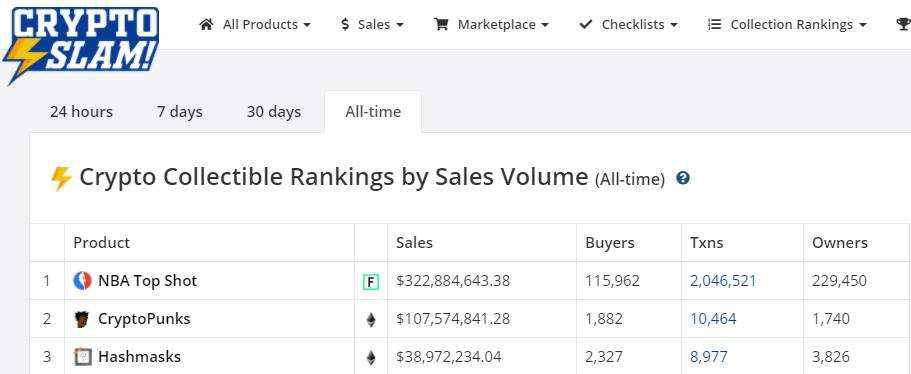 一面是,NBA球星的精彩瞬间NFT NBA Top Shot的用户和成交额仍在续刷新高。Cryptoslam数据显示,截至3月9日,NBA Top Shot销售额已经超过3.2亿美元,单是“买家”数量就超过11.6万人,远超第一大圈内第一大DeFi平台Uniswap,继续着加密圈与现实世界玩家的大联欢。