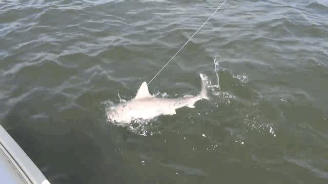 罗斯奋力将咬钩的鲨鱼拖上岸