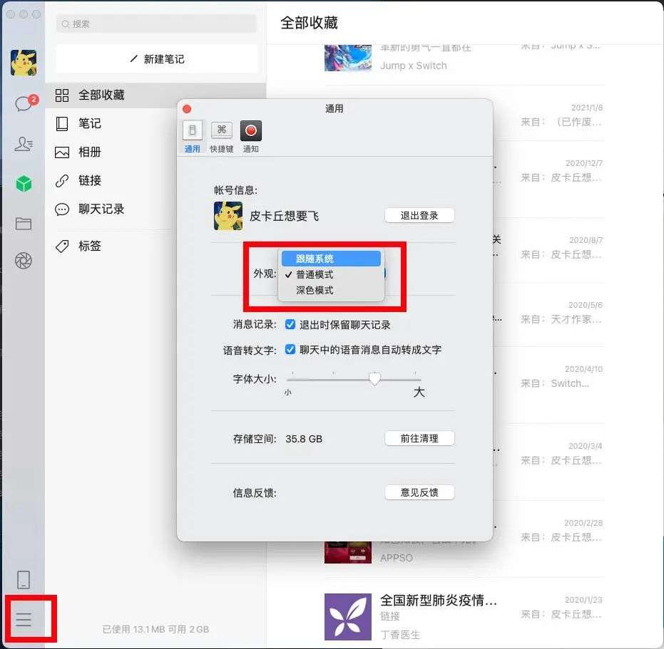 其次,最为直观的变化是,我们可以通过右下角的菜单进入设置,在「通用设置」中自定义深色或浅色外观了。